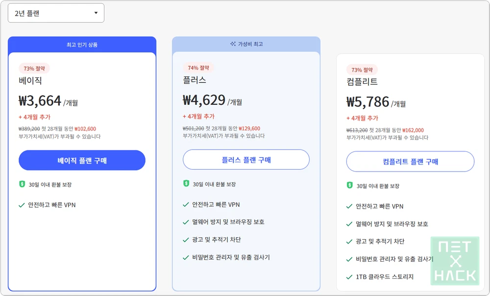 처음 NordVPN 가입하실 때 2025년 10월 10일 기준으로 플러스 플랜을 선택하면 월 965원만 추가하면 NordPass와 패키지로 구매할 수 있습니다. 1700원 vs 965원 퍼센트로 따지면 엄청 큰 차이죠.