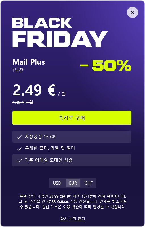 프로톤 메일(ProtonMail Plus) 블랙프라이데이 할인 버튼 생겼어요.