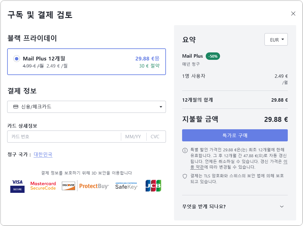 그런데 이상합니다. 분명 2026년 1월까지 ProtonMail Plus를 월 $1.99에 제공한다고 했었거든요. – 프로톤 블프 할인 계획보기 그 사이에 계획이 바뀐건지? 프로모션 가격이 이렇게 떴으니 이게 맞겠죠. 아마 그 전에 공지가 잘못됐을 가능성도 있으니 갑자기 내리진 않을 것 같기도해요.