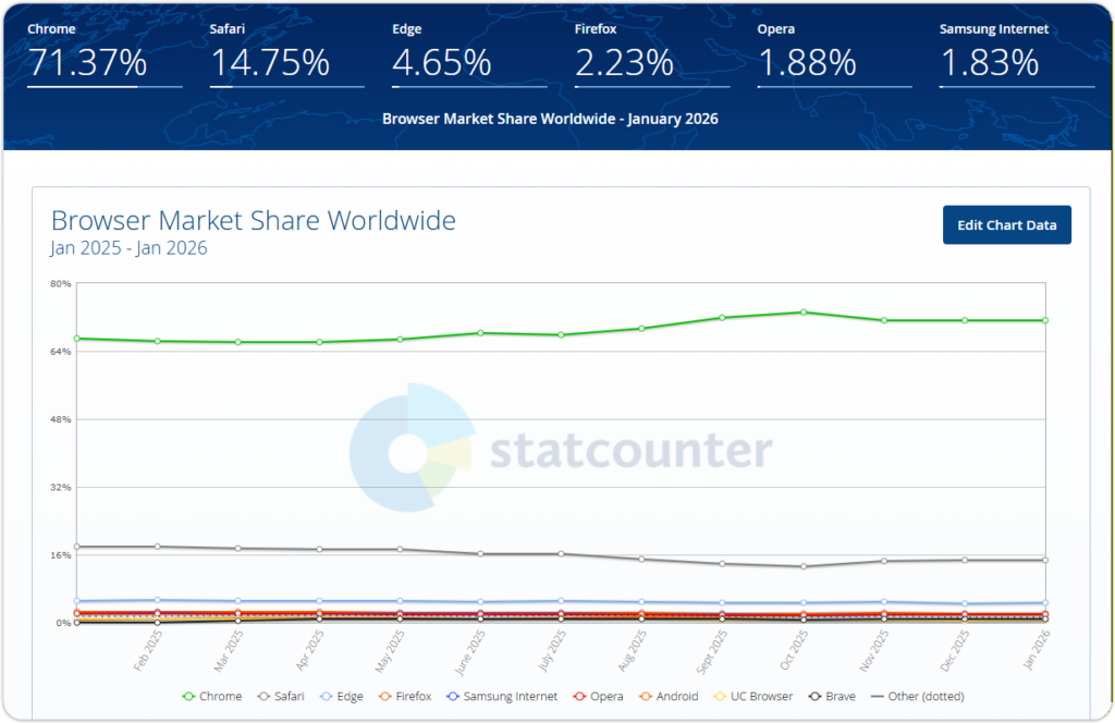 크롬 점유율은 2025년 4월 기준 66.16%로 오히려 훨씬 더 올라갔고, 2026 2월에 확인해보니 71.37%로 훨씬 더 강력해진 상태입니다. 반대로 사파리 브라우저는 느린 하락세네요. 아이폰/맥 점유율 때문에 이익을 본거지 웹 브라우저 자체의 매력은 떨어진다고 생각합니다. 저도 맥북을 정말 많이 사용하지만 사파리는 사용하지 않아요.