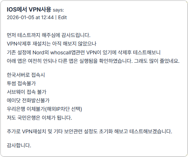 whoscall 앱 관련 VPN 터널 설정된게 있어서 그것을 삭제하셨더니 안되는 앱이 훨씬 줄어들었다고 해요! 하지만 여전히 몇가지 앱이 안된다고 하니 얼마나 불편하시겠어요.