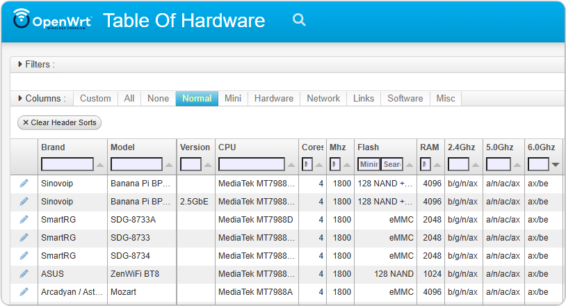OpenWrt 지원하는 하드웨어 중 Wifi7 옵션을 추가해서 나열해보니 바나나파이 R4 말고는 선택지가 없었어요. zenwifi bt8은 해외 직구만 가능한데 50만원정도하고, SmartRG라는 회사의 제품이 굉장히 좋아보였는데 B2B 판매만 진행중인 것 같았어요.