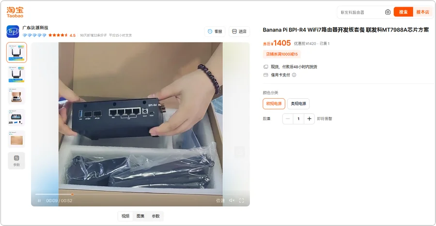 타오바오 BPI R4 Wifi7 패키지 상품(https://item.taobao.com/item.htm?abbucket=4&id=979342351506)은 ¥1405(USD 199.51) 정도로 나옵니다. 중국은 150달러 이상은 관세가 부과됩니다.