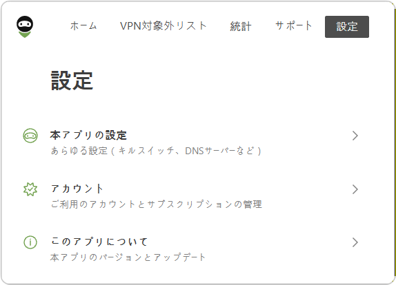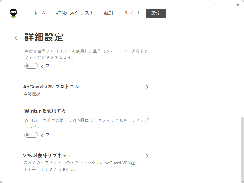 - 自動アップデート (O) / ログインする時AdGuard VPN実行 / アプリ実行時自動接続 : アップデートだけオンにしておきました。