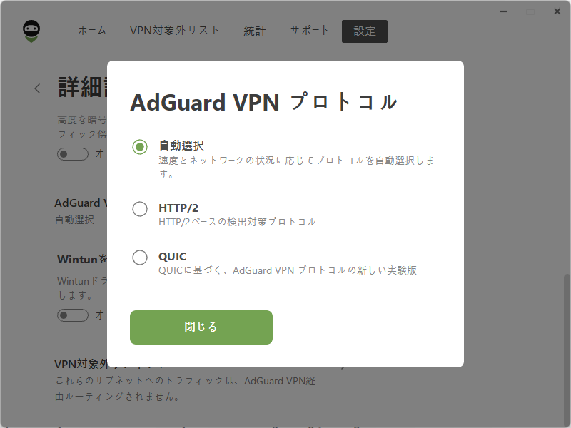 Windowsクライアントの場合、高度設定にWintun使用が追加されました。(Windows/Mac設定画面が少し異なります。)Wintunはトラフィックリダイレクトドライバーですが複雑な説明を除いてこの機能の目的はVPN接続品質向上だと言います。それまではWFPドライバー、TDIドライバーを使用したそうですが知らなくても良い部分であり私たちは結果だけ見れば良いです。