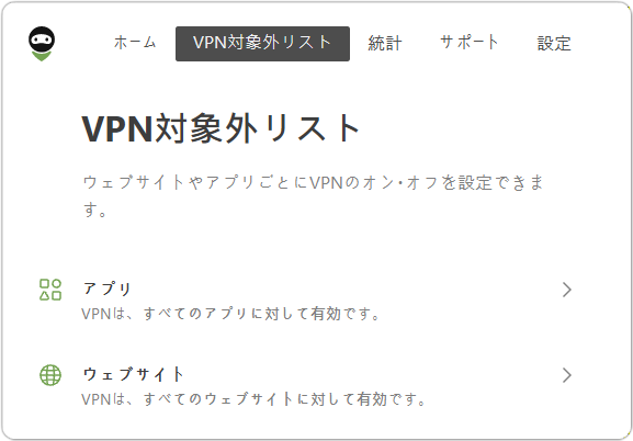 私がVPN使用する時最も多く使うものの一つがスプリットトンネリングです。VPNを24時間オンにしておいてP2P、セカンドウェブブラウザにのみ適用させておいてメインブラウザは日本IPで使用する式で使用できますね。
