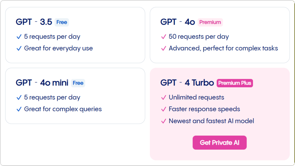 先ほど申し上げたPtivate AIは一般プレミアムアカウントユーザーの場合一日に50個の質問ができます。たまに使用する人々はVPNと一緒に使用するので大丈夫ですが頻繁に使用する方々はPremium Plusに加入しなければなりません。しかし上記のメニューもやはり2024年以降アップデートされていません。