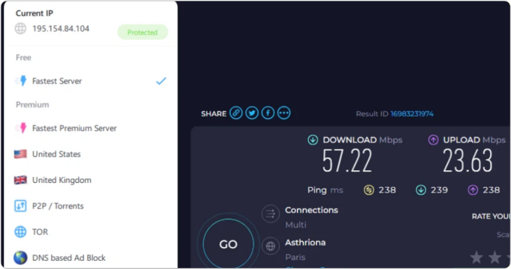 何度も試みるとSpeedtestがたった一度可能でしたが最も速いサーバーを選択した時はフランスサーバーが選択され57.22Mbpsが測定されました。