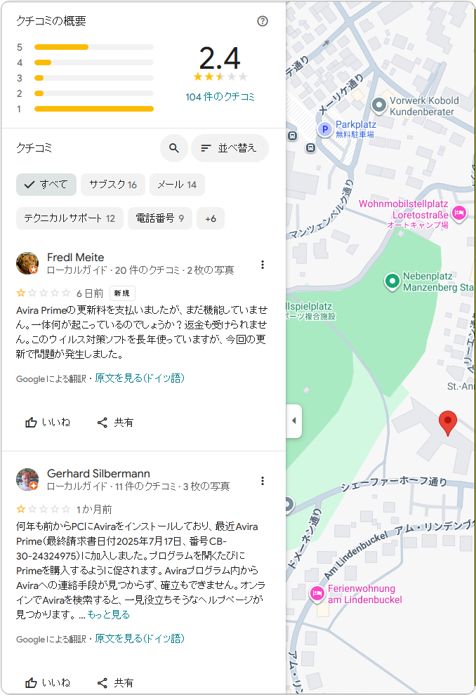 会社位置を見ようとしてGoogleレビューを見ることになりましたが、大部分Aviraが位置するドイツ人たちのレビューが多かったです。スペイン語もありましたし。計81個のレビューがあり評点は2.7点/5点非常に良くなかったです。