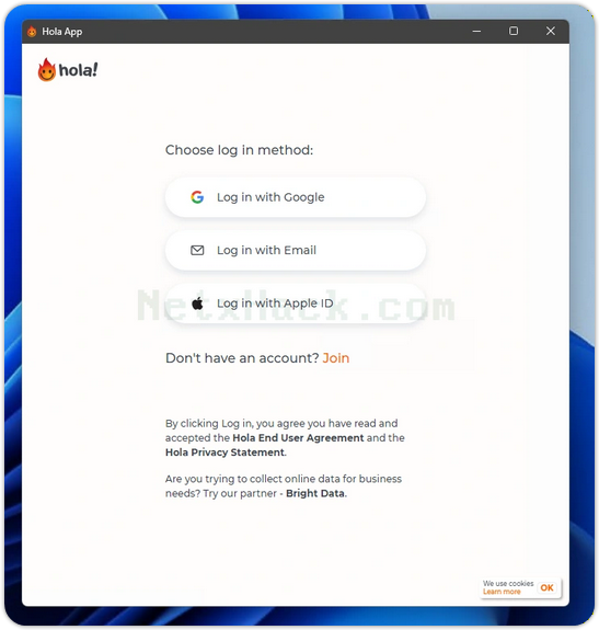 「Hola Free VPN Proxy、Hola Fake GPS 位置、および Hola Video Accelerator を無料で利用する代償として、Bright Data ネットワークのピア(Peer)になることができます。そうすることで、お客様はサービス利用規約を読み、同意したものとみなされます。」