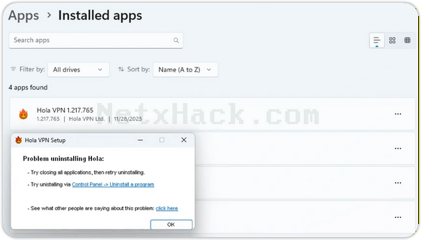 「Problem Uninstalling Hola」と表示され、削除できないことがあります。アプリを終了したつもりでも、バックグラウンドでプロセスが動き続けているためです。タスクマネージャー(ショートカット:Ctrl + Shift + Esc)を開き、Hola VPNに関連するプロセスをすべて強制終了してから削除してください。