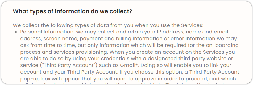 - 個人情報:当社は、お客様のIPアドレス、氏名およびメールアドレス、ユーザー名、決済および請求情報、または当社が随時要請する可能性のあるその他の情報を収集し保管することがあります。