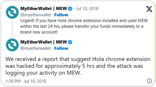 - 仮想通貨ウォレット事件:ウォレットサービスのMyEtherWalletによれば、事件当時、Hola VPNのChrome拡張機能が5時間にわたりハッキングされた状態にありました。この間にVPNを接続した状態で同サービスを利用したユーザーは影響を受けている可能性があるため、新しいウォレットを作成しトークンを転送するよう警告が出されました(以下の画像参照)。