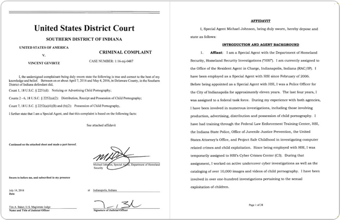 上記裁判所文書は国土安全保障省国土安全捜査局(HSI)所属特殊要員が自身を紹介することから始まります。インディアナ州インディアナポリスの常駐要員担当事務所(RAC/IP)に配置され.. 4年間連邦TaskForceに配置され二つの機関で勤務し児童搾取ポルノに関連した捜査に関与し調査のために連邦法執行訓練センター、HSI、インディアナ州警察、青少年司法予防局、米国検察庁、プロジェクトセーフチャイルドで教育を受けサイバー犯罪センター(C3)に配置された後サイバー潜入捜査および関連した100件以上の調査に参加したという言葉で始まります。