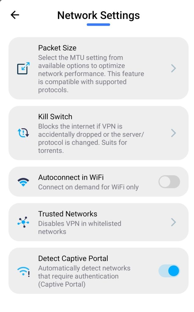 Network Settings에는 Packet Size 변경, 킬 스위치, 와이파이 환경에서 자동 VPN 접속, 신뢰하는 네트워크, Detect Captive Portal이 있는데 저는 모든 옵션을 Off했습니다. Kill Switch는 켜놔도되지만 나머지는 불필요합니다.