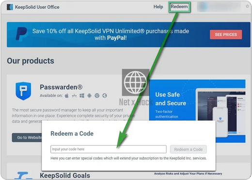 KeepSolid에서 VPN Unlimited 페이지에서 로그인 하신후에 저기 Redeem 메뉴를 눌러서 입력하시면 활성화 됩니다.