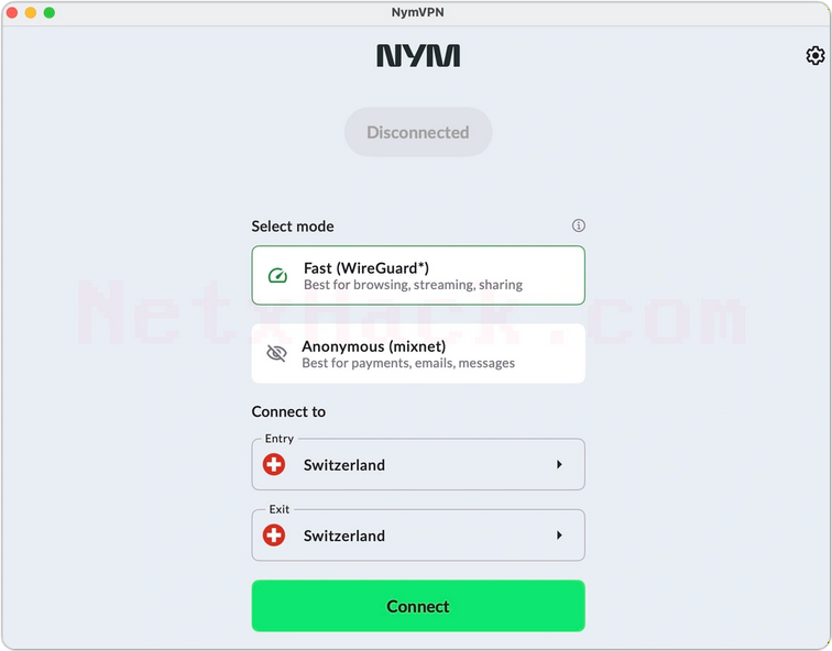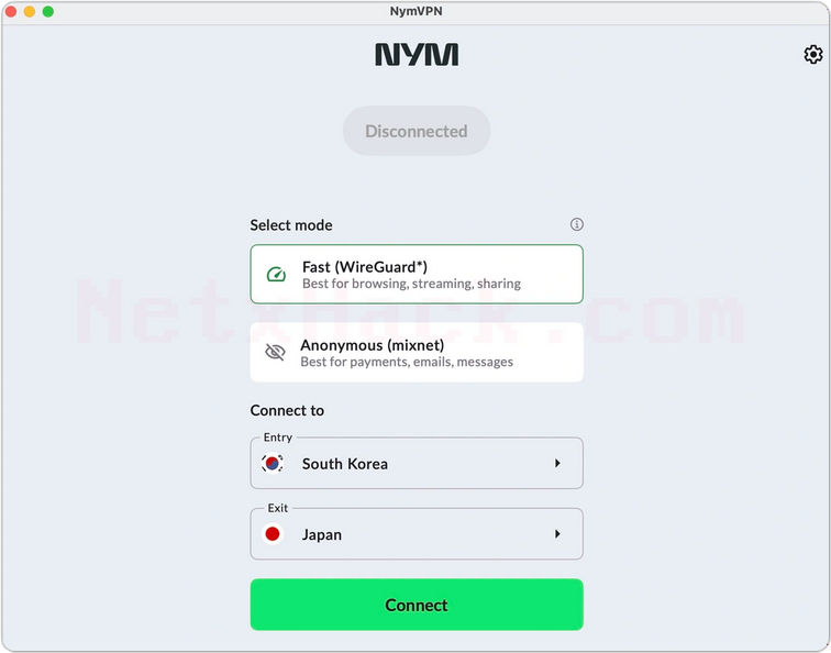 速度はさらに犠牲にしなければなりませんがNymVPNで自慢するMixnetを利用するには匿名モードを使用すれば良いです。以下のミックスネットは別途説明します。