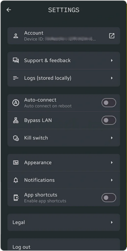 Androidアプリをダウンロードして実行してみるとBypass LAN、Kill Switchメニューがありますね。キルスイッチは追加予定だと言っていましたがAndroidには入っていますね。