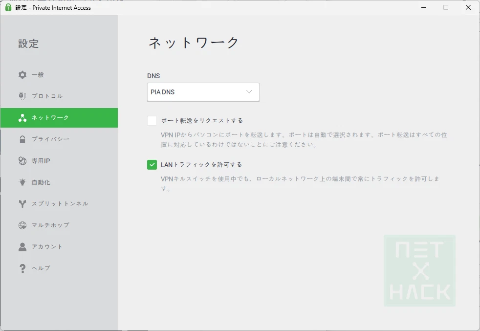 ネットワークではDNS選択、ポート転送リクエスト、LANトラフィック許可3つのオプションが見えます。基本のままにしておいても良いです。本人が好むDNSサービスがあれば変えられます。