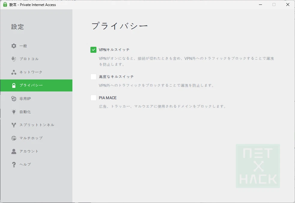 機能についてよく分からなければキルスイッチとPIA MACE二つだけチェックしてください。