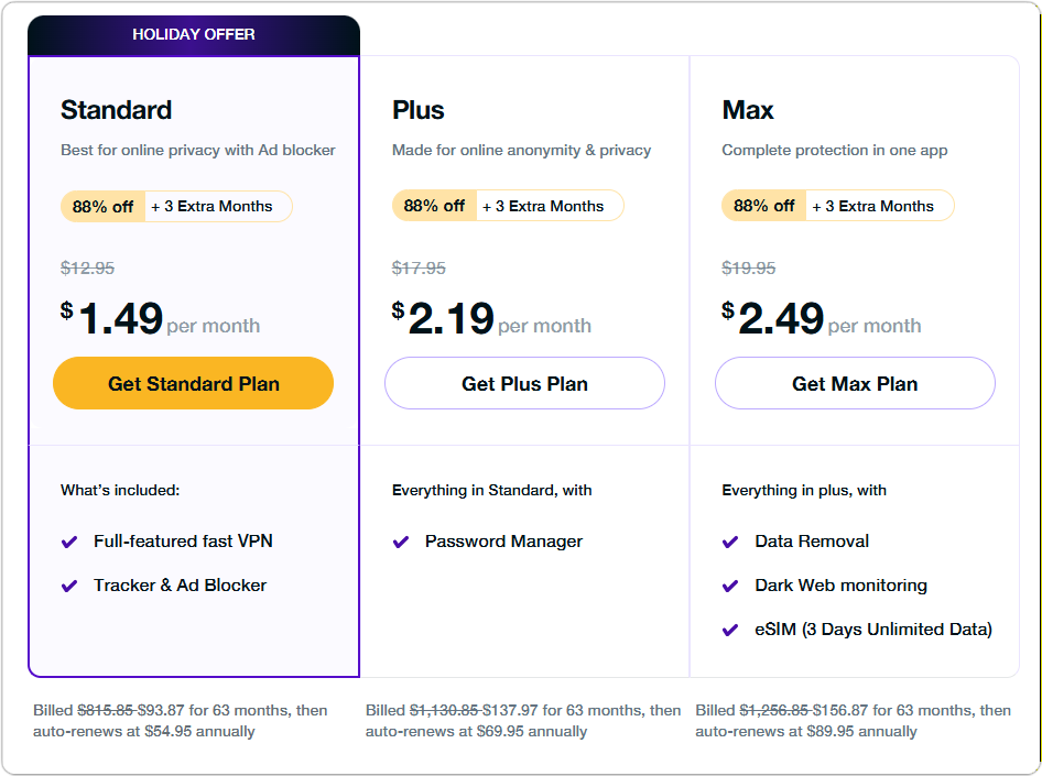 2年Standardプランは月 $1.49と安い水準ですが、上級サービスであり現在最高の一つと評価されるSurfsharkも非常に安いため依然として難しい状況です。- Surfshark Review 精読後比較してみて選択してください。