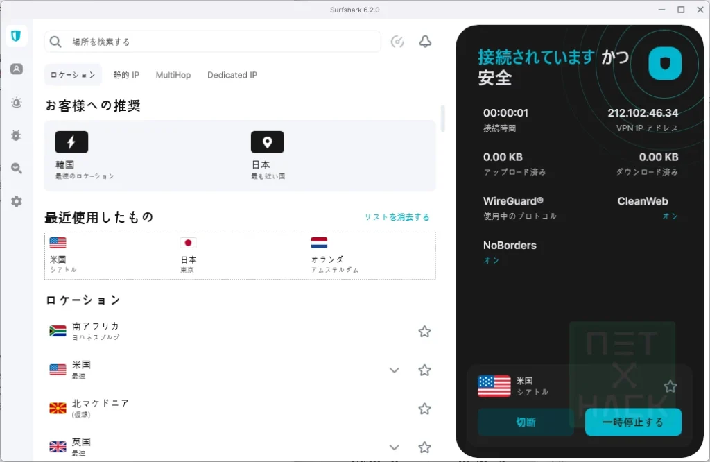 マルチホップが優れている理由は、表面的には物理的に2台のサーバーを通過しているように見えますが、単一サーバーでも実績のあるノーログサーバーであるため、ハッカーや政府がSurfsharkのサーバーをハッキングしたり差し押さえたりしても痕跡を見つけることは困難です。さらに2台のノーログサーバーを通過して使用するということは、量子コンピュータが実用化された後に可能性を議論すべきレベルの安全性だと考えます。