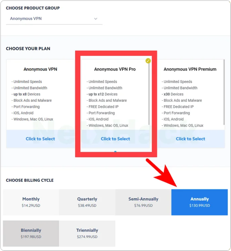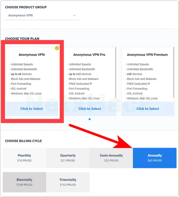 VPNユーザーはコスパが最も良い2年プランを主に選択します。Bienniallyが2年という意味ですが最も安いAnonymous VPNが基本商品が2年$197.98です。現在ランキング1位、2位VPNより数倍高い価格です。「それだけの理由があるのではないか?」という考えで使用し見守ってきましたが隠れた長所はありません。