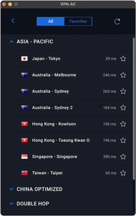VPN.ACの長所だと言える部分です。文字通り中国で使用するのに最適化されたサーバーたちです。中国は全世界でインターネット検閲、遮断レベルが最も強力で技術力もまた最高水準なので、VPN会社の立場では難しいほかありません。