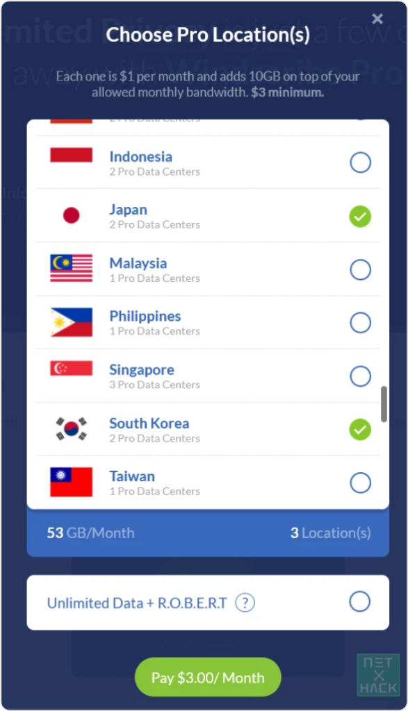 最高3つの国を選んで月 $3から決済が可能ですが、53GB/Month呆れたことに使用量制限があります。3ドルならウォン/ドル1400ウォンとした時月4200ウォンです。50ギガという非常に少ない使用量制限にNordVPNより高い価格だなんて実は有料プランを購入する人々は何かよく知らずに選択したと見なければなりません。