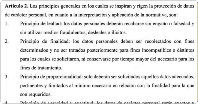 | 適法性原則 (Articulo. 2.8) | データ処理が適法であるためにはデータ所有者の事前、情報に基づいた、明確な同意や法的根拠がなければならない | 同意なしにログを保存するには明確な法的根拠が必要であり、そうでなければ違法 |