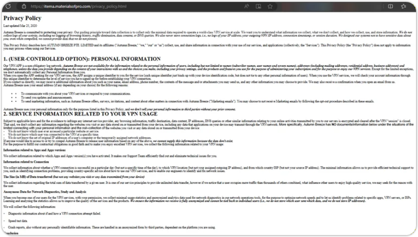 - 会社:「Autumn Breezeはユーザーの個人情報を保護するため、最小限のデータ収集を原則とします。このポリシーは Autumn Breeze PTE. LIMITED およびその系列会社がVPNサービスの利用に関連して収集、使用、共有する情報を説明する」と始まりますが、検索してもろくに出てこない会社名がなぜここで出てくるのか説明もありません。
