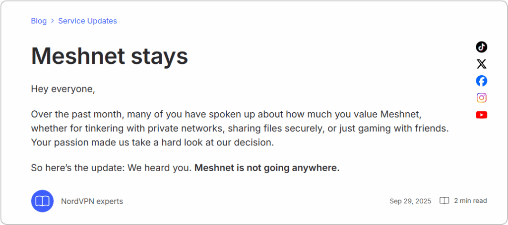 - Joel Nordahl (8 days ago): 좋은 소식입니다! 감사합니다. 저는 NordVPN을 정말 좋아했는데 Meshnet이 사라진다고 해서 슬펐습니다. 그래서 이 소식은 정말 좋은 소식입니다!