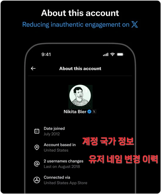 예시로 올라온 사진에는 첫 가입 날짜, 계정이 속해있는 국가, 유저 네임 변경 이력, Connected via 이건 X 앱을다운로드받은 마켓의 국가 정보가 표기되는 걸까요?