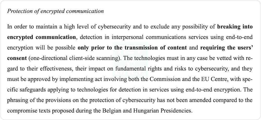 높은 수준의 사이버보안을 유지하고 암호화된 통신에 대한 침입 가능성을 배제하기 위해, 종단간 암호화를 사용하는 대인 간 통신 서비스에서의 감지는 콘텐츠 전송 전 단계에서만 가능하며 사용자의 동의를 요구합니다(단방향 클라이언트 측 스캐닝). 해당 기술은 반드시 효과성, 기본권에 미치는 영향 및 사이버 보안 위험 측면에서 검토되어야 하며, 위원회와 EU 센터가 공동으로 참여하는 시행 법령을 통해 승인되어야 한다. 특히 종단간 암호화 서비스를 활용한 감지 기술에는 특정 안전장치가 적용된다.