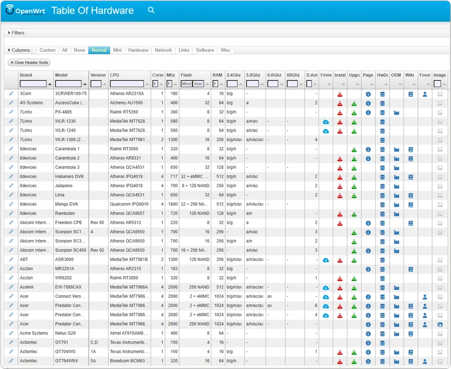 예를 들어 iptime 중에서 OpenWrt 지원하는 가장 고성능 공유기를 찾고싶다면 첫 번째 Brand 칸에 iptime을 입력하고 훑어보셔도되는데 제품명이 너무 많은 브랜드라면 Core 혹은 RAM, Mhz 등의 버튼을 눌러서 정렬할 수 있습니다. 지금은 아이피타임 공유기 중에서는 AX7800M-6E, Asus는 RT-AX89X, ZenWiFi BT8이 가장 고스펙으로 보입니다.
