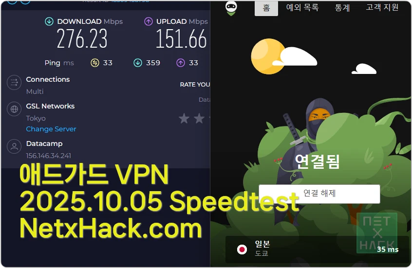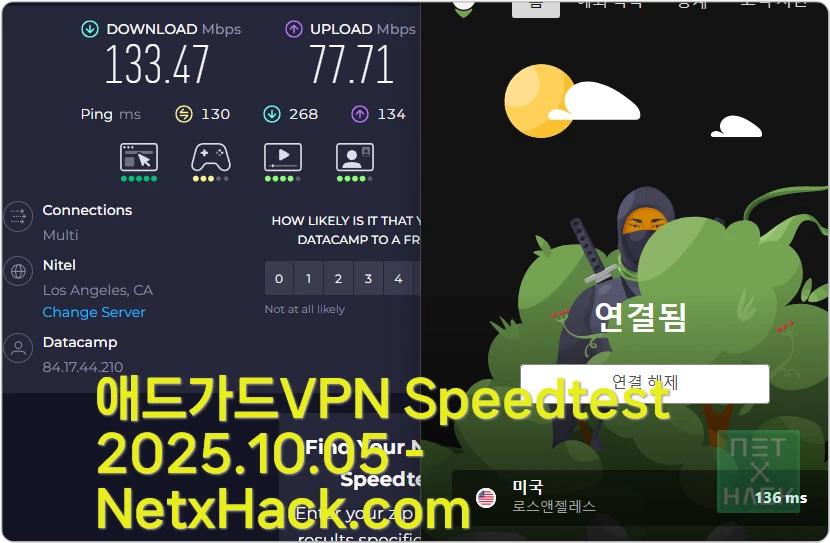 아이고.. 지금 막 테스트해서 바로 올렸는데 속도가 오히려 더 느려졌네요.. 얘들 서버 관리 아직도 잘 안되는 듯.. 애드가드VPN은 과거에도 서버가 불안정-안정 상태가 반복되었습니다. 다음달 테스트하면 더 빠른 속도가 나올 수 있겠지만 유료 VPN는 이렇게 속도 편차가 심하면 안됩니다.