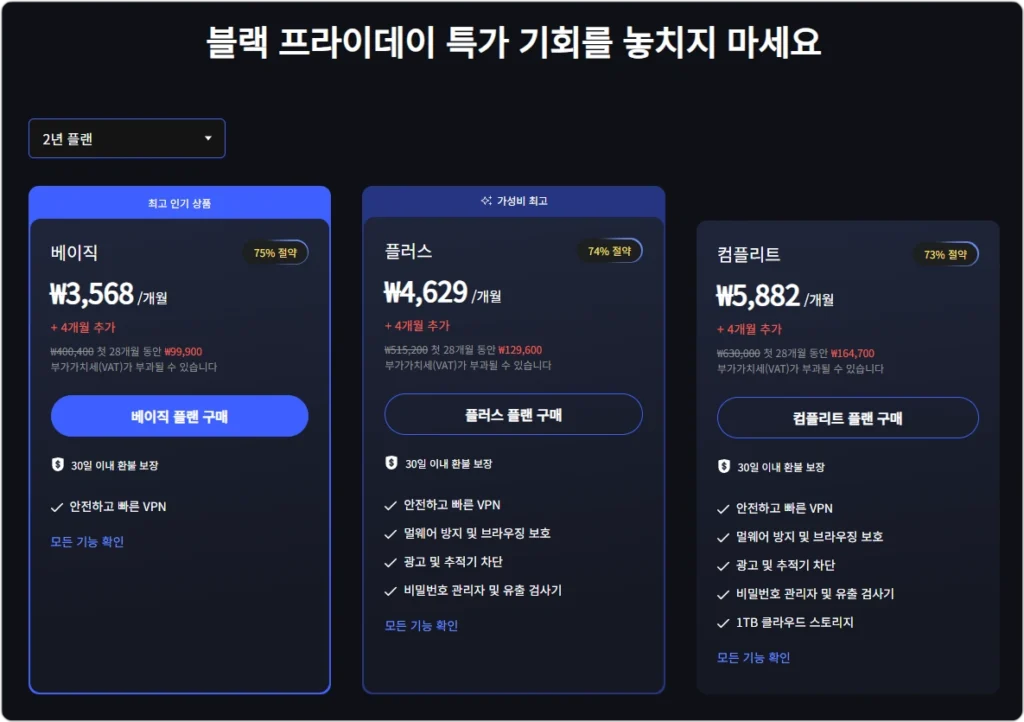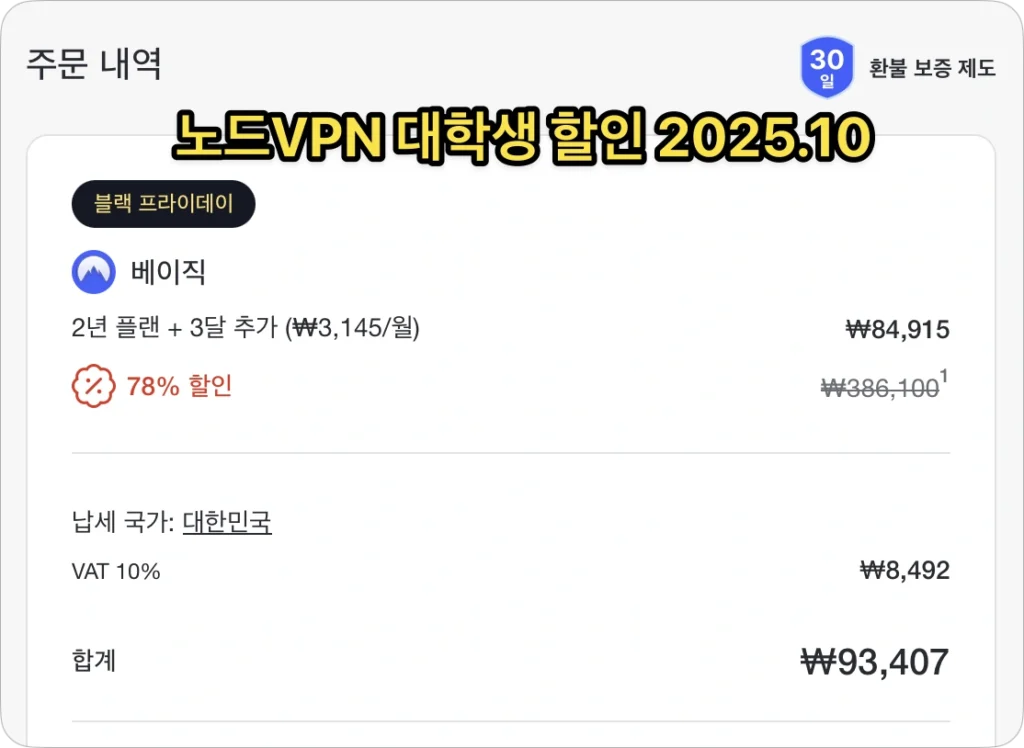 동일하게 NordVPN 베이직 2년 플랜, 아래 공식 최대 할인 프로모션 링크로 들어가시면 99,000원 입니다. 대학생 메일 계정 구할 수 없으면 가장 저렴한 채널이예요.