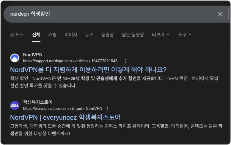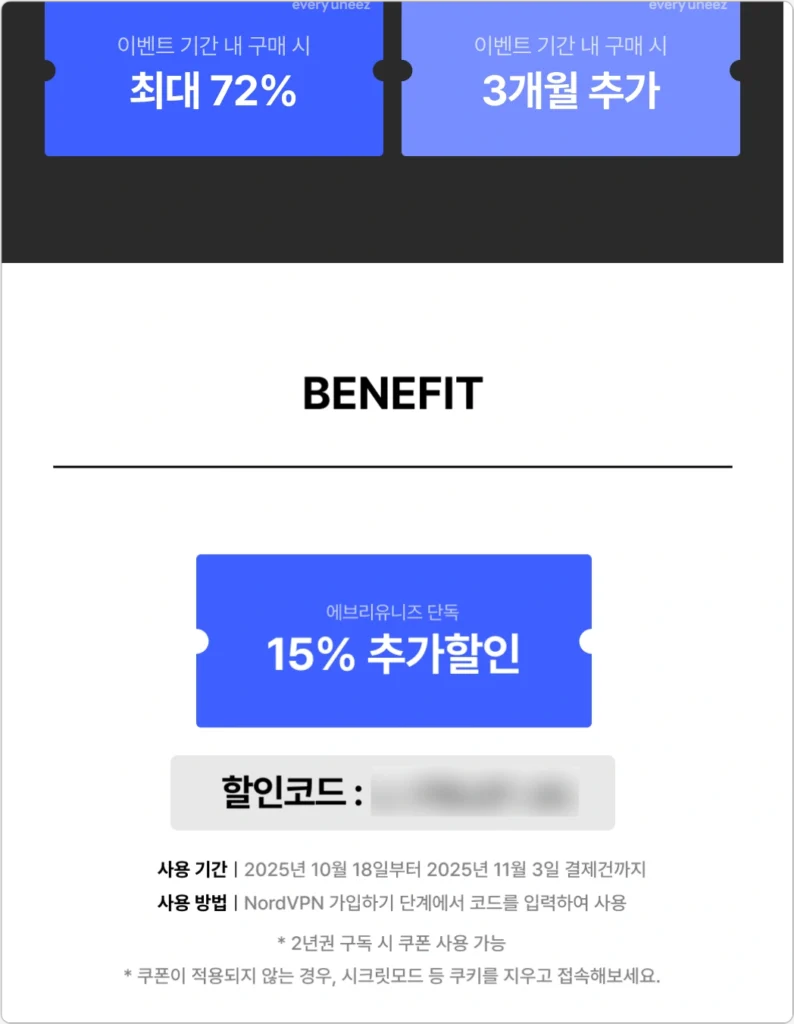 - 에브리유니즈 노드VPN 대학생 할인은 15% 추가 할인 쿠폰 코드가 제공되어 최종 가격은 대학생 할인이 더 저렴합니다.