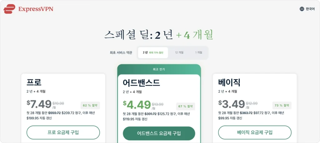 가자 많이 가입하는 베이직 플랜 2년이 +4개월 그리고 73% 할인으로 나옵니다. 아래의 링크 역시 익스프레스VPN에서 공식적으로 제공되는 Exclusive Special Deal 입니다.