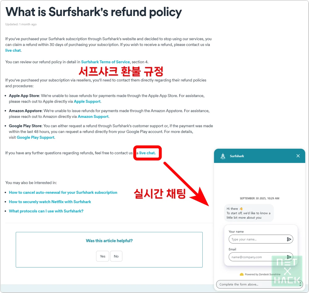 - 채팅: 서프샤크 실시간 채팅으로도 가능한데, 링크를 찾기 어려우시면 Surfshark Refund Policy로 들어가신 후 아래 이미지와 같이 live chat 버튼을 누르시면 됩니다.