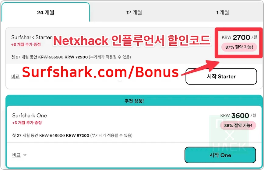 surfshark.com 공식 홈페이지 주소로 그냥 접속하시면 아래 할인 전 가격이 적용됩니다.