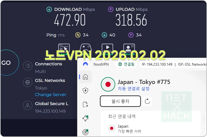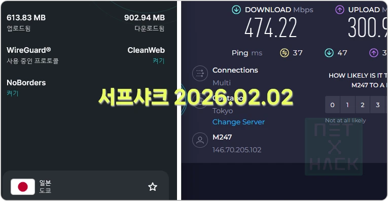 서프샤크, 노드VPN 둘 다 일본 서버 기준으로 470Mbps 정도가 나옵니다. 유료 VPN이라면 편차가 심하지 않고 빠른 속도를 1년내내 제공할 수 있어야 합니다.