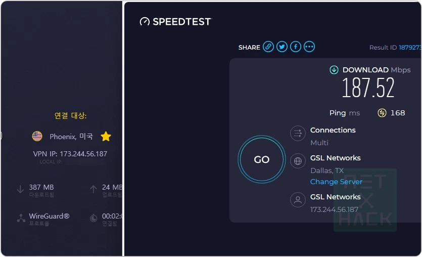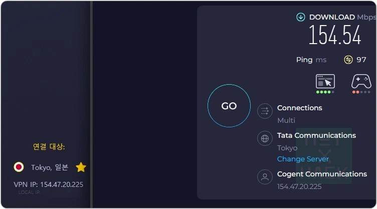 일본 서버가 오히려 154.54Mbps로 더 느리게 측정되었습니다. 여러개의 VPN을 가지고 있기 때문에 사이버고스트 서버가 느리다는 것은 확실히 말씀드릴 수 있습니다. (KT 500M 회선 기준)