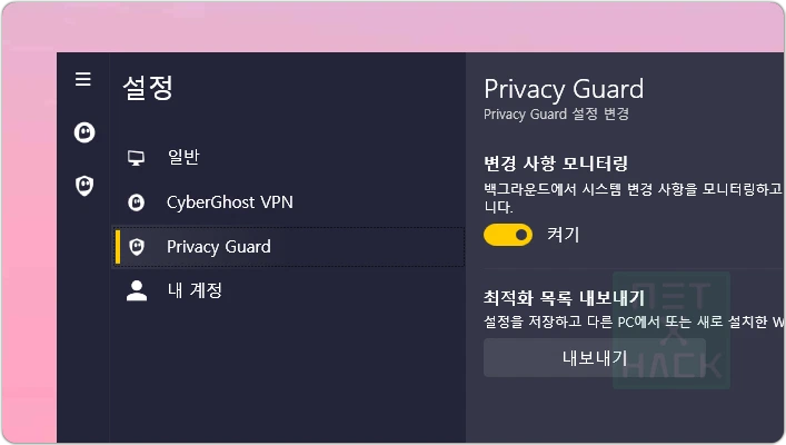 우선 Privacy Guard는 사이버고스트 윈도우용에 있는 기능인데, 윈도우에서 자잘한 기능들을 꺼주는 역할을 합니다. 자세한 것은 [사이버고스트 리뷰]에서 보실 수 있는데요. 초보분들은 설정 적용 이후에 뭐가 잘 안되면 혼란스러울 수 있으니 잘 모르는 설정은 건들지 않는게 좋을듯합니다.
