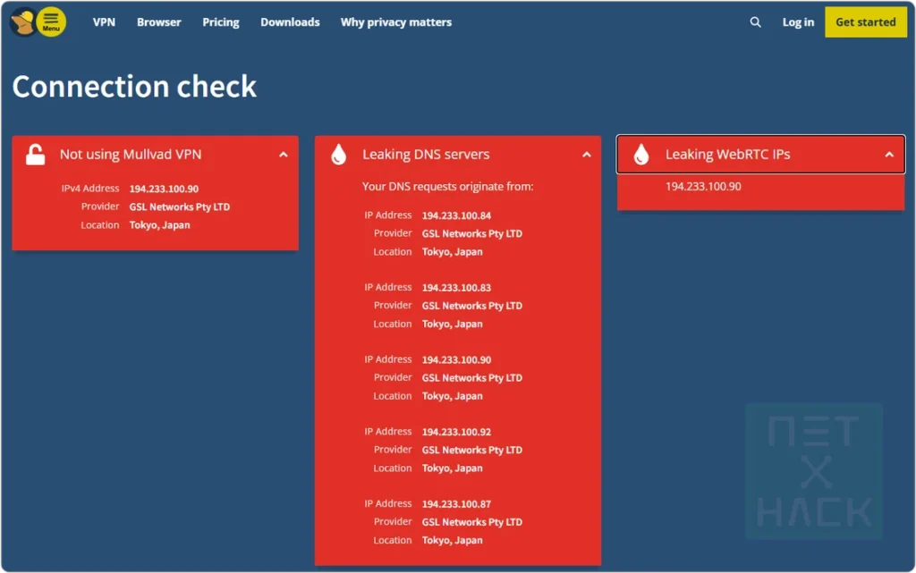 Mullvad도 DNS Leak Test 페이지를 제공하는데 다른 VPN으로 접속하면 마치 유출되는 것 처럼 보이도록 분위기를 연출하죠. 위 결과는 전혀 유출이 없고 안전한 상태이므로 모두 녹색으로 나오는게 맞습니다. 모든 회사는 자사 서비스를 선택하도록 다양하고 많은 노력을 합니다.