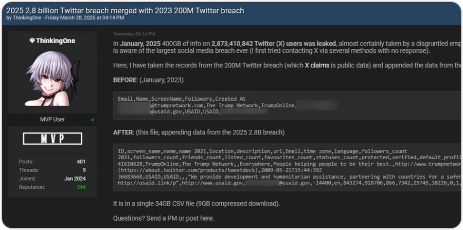 ThinkingOne이라는 작성자(뉴스에 따라 해커라고도하고 데이터 분석 업체라고도 하네요.) 2025년 3월 말에 400GB 규모의 사용자 데이터가 다크웹에 풀렸고, 28억개 이상의 x 사용자 계정 정보가 포함되어있는데 여기에는 사용자 ID, 실명, 위치, 이메일 주소, 팔로워 수, 프로필 정보 등이 포함되었다고해요.