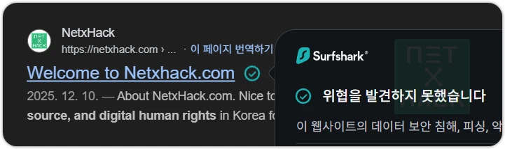 구글 검색 결과에서 URL 주소 오른쪽에 안전하면 체크 마크가 뜹니다. netxhack.com은 안전합니다.