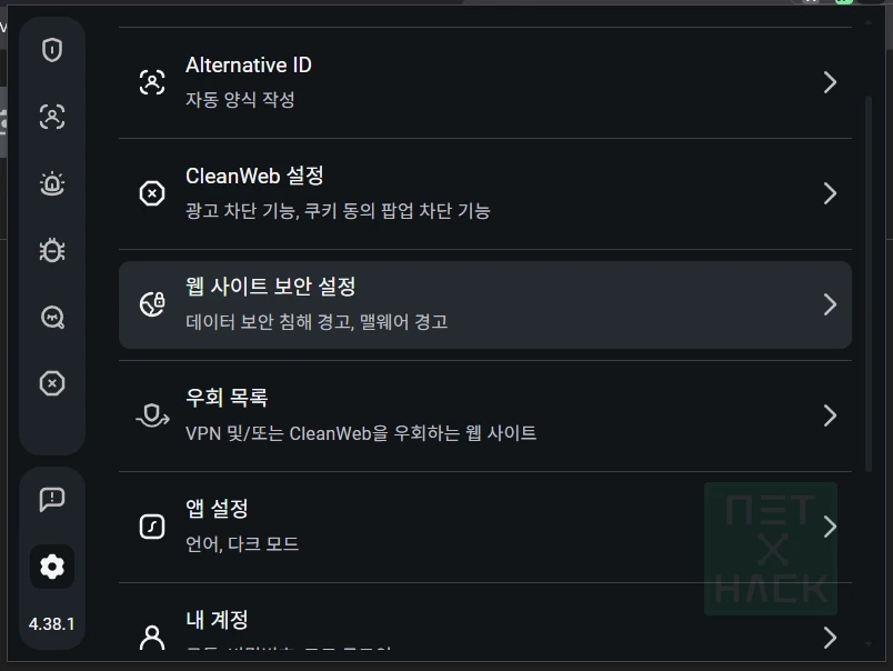 왼쪽 패널 가장 아래있는 톱니바퀴 버튼을 누르시면 설정으로 진입할 수 있습니다. 거기서 ‘웹 사이트 보안 설정’을 누르세요.