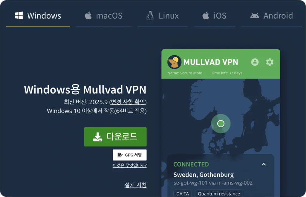 Mullvad는 조금 늦은 2025년 2월 8일에 공식 발표했습니다. Mullvad 윈도우 앱 다운로드 페이지로 들어가면 위의 이미지와 같이 나오는데 따로 ARM 다운로드 링크가 없는 것으로보아 ARM 아키텍처 디바이스로 접속하면 보일 것 같네요.