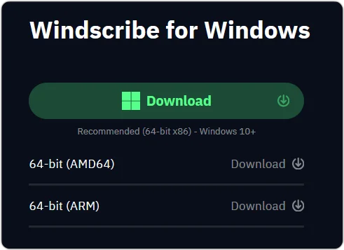 Windscribe 윈도우 앱 다운로드 페이지로 가시면 위 이미지 처럼 나옵니다. 두 번째 64-bit (ARM)을 다운로드하세요.